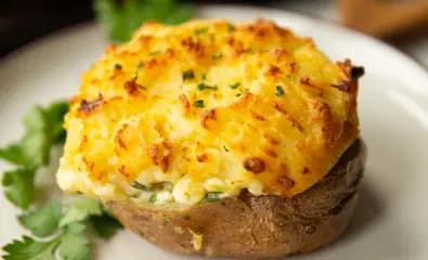 A delightful blend of baked potatoes filled with a creamy fish pie mixture, topped with cheese and baked until golden.